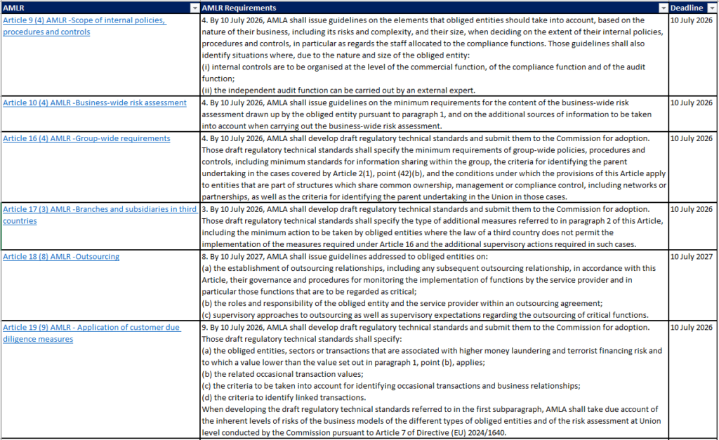 | Article 50 AMLR -Guidelines on reliance on other obliged entities | By 10 July 2027, AMLA shall issue guidelines addressed to obliged entities on: (a) the conditions which are acceptable for obliged entities to rely on information collected by another obliged entity, including in the case of remote customer due diligence; (b) the roles and responsibility of the obliged entities involved in a situation of a reliance on another obliged entity; (c) supervisory approaches to reliance on other obliged entities. | 10 July 2027 |