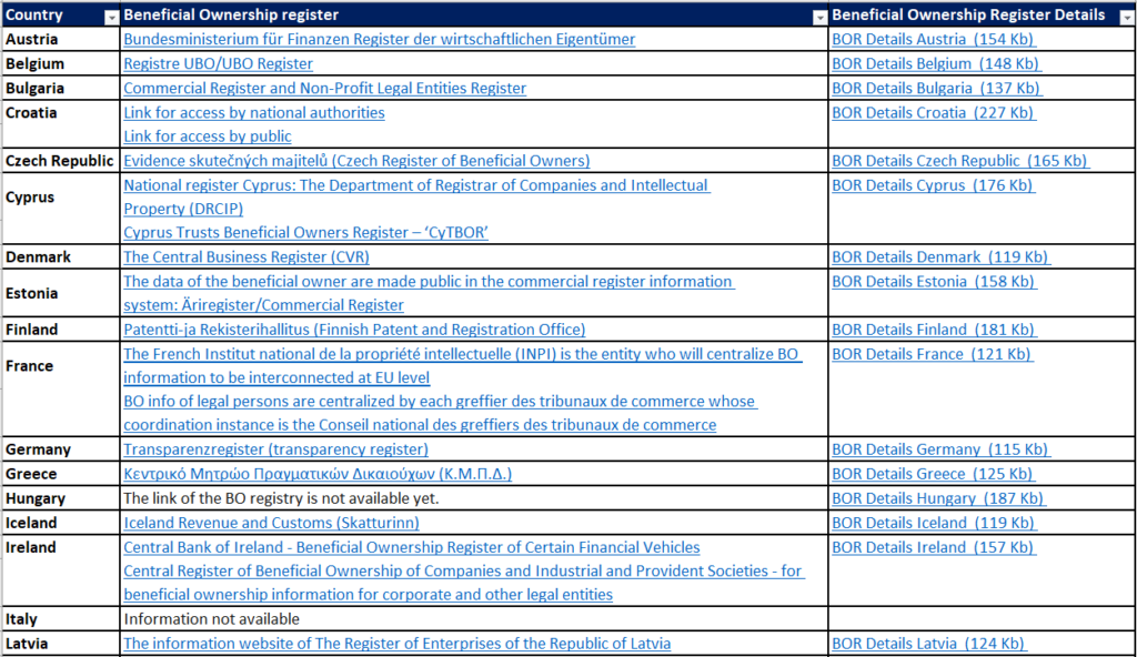 The table on this page provides a country-by-country overview of official national Beneficial Ownership Registers (BORs) within the European Union and selected European jurisdictions.